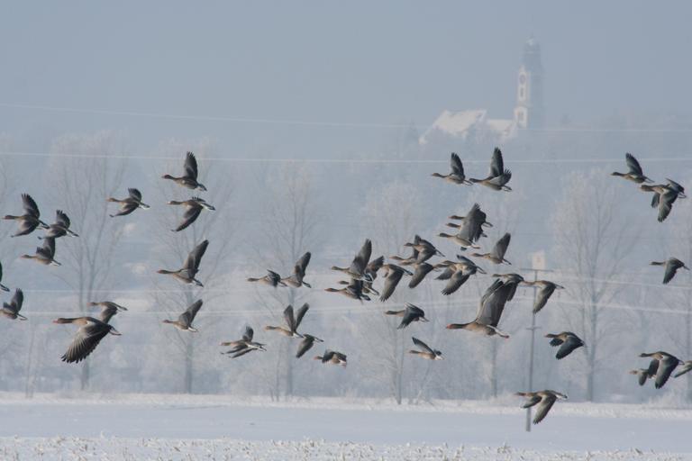 Keywords: wild geese fly winter geese birds flock of birds swarm formation snow