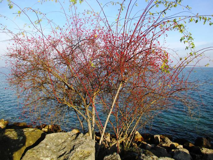 Keywords: wild rose beautiful rose hip red romanshorn lake stones sky blue green leaves branches plant nature