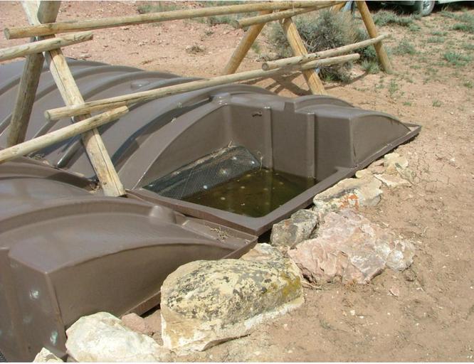 Keywords: Wildlife water guzzler - US Bureau of Land Management - 2009.jpg en A wildlife guzzler installed in 2008 at the Pryor Mountains Wild Horse Range in Montana in the United States The guzzler is a precipitation usually rainwater collection device which traps water in a storage tank ranging in size from a few to several thousand gallons/liters The storage tank can be above-ground partially buried or below-ground A mechanical valve senses when there is not enough water in the trough and releases more water into the drinking trough from the storage tanks Guzzlers are usually used to provide wildlife and sometimes domestic animals with temporary water sources during dry seasons <br/> Note the screen which prevents rodents from climbing into the storage tank and polluting it The wooden fence prevents animals from trampling on and damaging the storage tanks 2009 http //www fs fed us/r1/custer/projects/projects/d2_wildhorses/PMWHR pdf Billings Field Office Bureau of Land Management U S Department of the Interior Pryor Mountain Wild Horse Range/Territory Environmental Assessment MT-10-08-24 and Herd Management Area Plan May 2009 p 72 PD-USGov Uploaded with UploadWizard Conservation infrastructure Pryor Mountains Wild Horse Range |