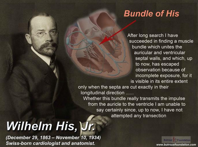 Keywords: Wilhelm His, Jr. (29 December1863 – November 10, 1934) was a Swiss-born cardiologist and anatomist.Wilhelm His, Jr. (December 29, 1863 – November 10, 1934) was a Swiss-born cardiologist and anatomist.. In 1893, he discovered the bundle of His, which is collection of specialized cardiac muscle cells in the heart that transmits the electrical impulses and helps synchronize contraction of the cardiac muscles.Later in life, as a professor of medicine at the University of Berlin, he was one of the first to recognize that "the heartbeat has its origin in the individual cells of heart muscle. jr wilhelmhis hisbundle