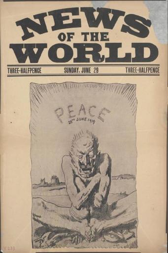 | Keywords: Wilhelm II News of the World caricature June 1919 by William Orpen.jpg Placard for the News of the World Peace 28th June 1919 caricaturing ex-Kaiser Wilhelm II as a naked sadhu Art IWM PST 12971 1 1919-06-29 Creator William Orpen PD-old-auto 1931 William Orpen News of the World Caricatures of Wilhelm II of Germany Treaty of Versailles Collections of the Imperial War Museum | ||||