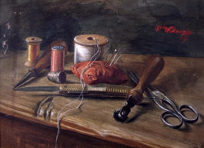 Keywords: Wilhelm Wittmann Stilleben mit Nähutensilien.jpg Stilleben mit Nähutensilien Aquarell 14 x 19 cm http //www zeller de 1889 Wilhelm Wittmann fl “1930 PD-old-70 Sewing in art Tailor scissors in art Thimbles 1889 paintings Tailoring Images from Auktionshaus Zeller 1880s still-life paintings |