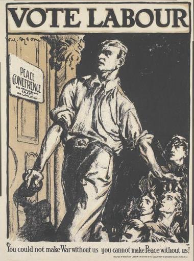 Keywords: Will Dyson Vote Labour 1918.jpg Poster Vote Labour Peace Conference No Admission Except on Coalition You could not make War without us you cannot make Peace without us PRINTED BY DAVID ALLEN AND SONS LTD AND PUBLISHED BY THE LABOUR PARTY 33 ECCLESTON SQUARE LONDON S W 1 Art IWM PST 12194 1 1918 Will Dyson PD-Art Will Dyson Labour Party UK Election posters in the United Kingdom 1918 UK General Election Collections of the Imperial War Museum |