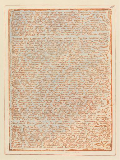 | Keywords: William Blake - Jerusalem, Plate 48, "These were his last words...." - Google Art Project.jpg print orange pen ink black watercolor paper cream Relief etching printed in orange with pen and black ink and watercolor on moderately thick smooth cream wove paper London 1757 London 1827 William male 2369124 Blake British 1757 - 1827 /collection/yale-center-for-british-art/artwork/jerusalem-plate-48-these-were-his-last-words-william-blake/2368888/ William Blake Artist /artist/william-blake/4130035/ 4130035 /collection/yale-center-for-british-art/ Yale Center for British Art 2305845 http //britishart yale edu/ 2/23/2012 9 46 58 PM /collection/yale-center-for-british-art/artwork/jerusalem-plate-48-these-were-his-last-words-william-blake/2368888/ 1804 1804 to 1820 birds wings serpent snake text vines historical subject Relief etching printed in orange with pen and black ink and watercolor on moderately thick smooth cream wove paper 225 2368888 False 1820 3/24/2012 2 50 23 PM YCBA/lido-TMS-3479 http //collections britishart yale edu/vufind/Record/1667765 Yale Center for British Art Paul Mellon Collection print 1800 1830 London Creation w165 x h225 cm 1804 to 1820 False 0 75390625 Volume jerusalem-plate-48-these-were-his-last-words-william-blake Jerusalem Plate 48 These were his last words j 165 No inscription Inscription _Signed_and_Dated Not signed not dated Not on View Relief etching printed in orange with pen and black ink and watercolor on moderately thick smooth cream wove paper birds wings serpent snake text vines historical subject special url_id jAGvJvG48XF-DA PD-old-100-1923 1827 Jerusalem The Emanation of the Giant Albion - copy E 048 Google Art Project works by William Blake |