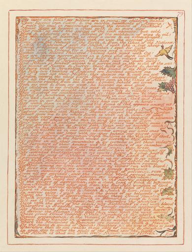 | Keywords: William Blake - Jerusalem, Plate 79, "My tents are fall'n...." - Google Art Project.jpg Google Art Project watercolor London 1757 London 1827 William male 2369124 Blake British 1757 - 1827 /collection/yale-center-for-british-art/artwork/jerusalem-plate-79-my-tents-are-falln-william-blake/2374576/ William Blake Artist /artist/william-blake/4130035/ 4130035 /collection/yale-center-for-british-art/ Yale Center for British Art 2305845 http //britishart yale edu/ 2/23/2012 9 47 49 PM /collection/yale-center-for-british-art/artwork/jerusalem-plate-79-my-tents-are-falln-william-blake/2374576/ 1804 1804 to 1820 bird fruits grapes leaf watercolor text vines historical subject Relief etching printed in orange with pen and black ink and watercolor on moderately thick smooth cream wove paper 222 2374576 False 1820 3/24/2012 3 27 26 PM YCBA/lido-TMS-3513 http //collections britishart yale edu/vufind/Record/1667804 Yale Center for British Art Paul Mellon Collection painting 1800 1830 London Creation w162 x h222 cm 1804 to 1820 False 0 76171875 Volume jerusalem-plate-79-my-tents-are-falln-william-blake Jerusalem Plate 79 My tents are fall'n j 162 No inscription Inscription _Signed_and_Dated Not signed not dated Not on View Relief etching printed in orange with pen and black ink and watercolor on moderately thick smooth cream wove paper bird fruits grapes leaf watercolor text vines historical subject special url_id KwH1AboIurmNyw PD-old-100-1923 1827 Jerusalem The Emanation of the Giant Albion - copy E 079 Google Art Project works by William Blake |