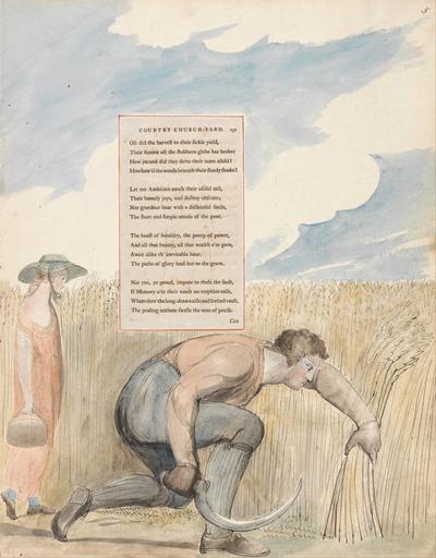 | Keywords: William Blake - The Poems of Thomas Gray, Design 109, "Elegy Written in a Country Church-Yard." - Google Art Project.jpg Inscribed in black ink upper right 5 ; in graphite center x ; on verso in black ink upper left 6 ; in graphite center x Inscription _Signed_and_Dated Not signed not dated Not on View Watercolor with pen and black ink and graphite on moderately thick slightly textured cream wove paper with inlaid letterpress page clouds sky harvest sickle rain father child boy girl man men women farming digging grain wheat straw dirt text trees hat gloves shovel basket historical subject special url_id EQEfDuKhkffm3w PD-old-100-1923 1827 Google Art Project works by William Blake William Blake's illustrations to Thomas Gray's Poems 109 Elegies in art |
