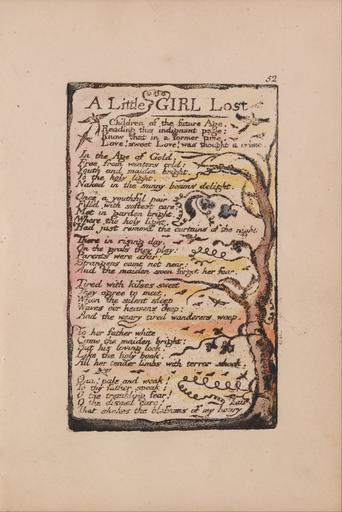 | Keywords: William Blake - Songs of Innocence and of Experience, Plate 52, "A Little Girl Lost" (Bentley 51) - Google Art Project.jpg print brown pen ink black watercolor paper cream Relief etching printed in dark-brown with pen and black ink and watercolor on moderately thick slightly textured cream wove paper London 1757 London 1827 William male 2369124 Blake British 1757 - 1827 /collection/yale-center-for-british-art/artwork/songs-of-innocence-and-of-experience-plate-52-a-little-girl-lost-bentley-51-william-blake/2376852/ William Blake Artist /artist/william-blake/4130035/ 4130035 /collection/yale-center-for-british-art/ Yale Center for British Art 2305845 http //britishart yale edu/ 2/23/2012 9 52 50 PM /collection/yale-center-for-british-art/artwork/songs-of-innocence-and-of-experience-plate-52-a-little-girl-lost-bentley-51-william-blake/2376852/ 1789 1789 to 1794 birds branches leaf text vines historical subject Relief etching printed in dark-brown with pen and black ink and watercolor on moderately thick slightly textured cream wove paper 124 2376852 False 1794 3/24/2012 3 38 52 PM YCBA/lido-TMS-3775 http //collections britishart yale edu/vufind/Record/1668021 Yale Center for British Art Paul Mellon Collection print 1780 1800 Felpham Creation w73 x h124 cm 1789 to 1794 False 0 66796875 Volume songs-of-innocence-and-of-experience-plate-52-a-little-girl-lost-bentley-51-william-blake Songs of Innocence and of Experience Plate 52 A Little Girl Lost Bentley 51 s 73 Inscribed in black ink upper right 52 Inscription _Signed_and_Dated Not signed not dated Not on View Relief etching printed in dark-brown with pen and black ink and watercolor on moderately thick slightly textured cream wove paper birds branches leaf text vines historical subject special url_id cQEzEoRIzTGGLA PD-old-100-1923 1827 Songs of Innocence and Experience - Copy L Google Art Project works by William Blake |