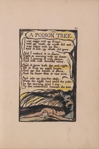 | Keywords: William Blake - Songs of Innocence and of Experience, Plate 50, "A Poison Tree" (Bentley 49) - Google Art Project.jpg print brown pen ink black watercolor paper cream Relief etching printed in dark-brown with pen and black ink and watercolor on moderately thick slightly textured cream wove paper London 1757 London 1827 William male 2369124 Blake British 1757 - 1827 /collection/yale-center-for-british-art/artwork/songs-of-innocence-and-of-experience-plate-50-a-poison-tree-bentley-49-william-blake/2389642/ William Blake Artist /artist/william-blake/4130035/ 4130035 /collection/yale-center-for-british-art/ Yale Center for British Art 2305845 http //britishart yale edu/ 2/23/2012 9 52 47 PM /collection/yale-center-for-british-art/artwork/songs-of-innocence-and-of-experience-plate-50-a-poison-tree-bentley-49-william-blake/2389642/ 1789 1789 to 1794 branches dead man men text trees nude historical subject Relief etching printed in dark-brown with pen and black ink and watercolor on moderately thick slightly textured cream wove paper 111 2389642 False 1794 3/24/2012 4 58 25 PM YCBA/lido-TMS-3773 http //collections britishart yale edu/vufind/Record/1668019 Yale Center for British Art Paul Mellon Collection print 1780 1800 Felpham Creation w70 x h111 cm 1789 to 1794 False 0 662109375 Volume songs-of-innocence-and-of-experience-plate-50-a-poison-tree-bentley-49-william-blake Songs of Innocence and of Experience Plate 50 A Poison Tree Bentley 49 s 70 Inscribed in black ink upper right 50 Inscription _Signed_and_Dated Not signed not dated Not on View Relief etching printed in dark-brown with pen and black ink and watercolor on moderately thick slightly textured cream wove paper branches dead man men text trees nude historical subject special url_id NQFkvbaVV2xLfQ PD-old-100-1923 1827 Songs of Innocence and Experience - Copy L Google Art Project works by William Blake |