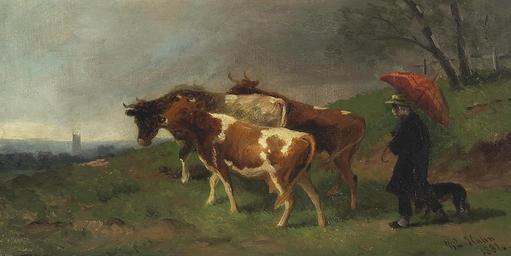 Keywords: William Hahn - Getting the Cattle Home.jpg Artwork creator William Hahn 1881 oil canvas in 7 13 5 object history credit line Wm Hahn 1881 signed/date lower right accession number http //www bonhams com/auctions/13316/lot/135/ Bonhams PD-old-auto-1923 1887 William Hahn Paintings of cattle Images from Bonhams |