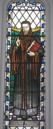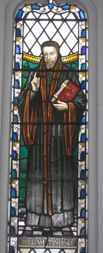 Keywords: William Tyndale 2.JPG en One of Arnold Robinson's windows in the Kingsdown area of Bristol Robinson designed and installed four three-light windows this a short while after the 1927 restoration and in the central light of these windows he depicts in turn John Bunyan William Tindale Archbishop Cranmer and Charles Wesley The right and left hand lights of the four windows are either plain or hold some coloured glass The window dedicated to Bunyan has John Bunyan in the centre light with a copy of Pilgrim ™s Progress tucked under his arm The window is inscribed To the Glory of God in loving memory of George Bradford Steers Sarah Jane Steers Below Bunyan Robinson painted a roundel with a scene from the Pilgrim ™s Progress The three-light window featuring William Tindale has Tindale carrying a copy of his famous Bible and in a roundel beneath he is depicted writing that Bible The window is inscribed In Loving Memory of Richard Dalton Another three-light window depicts Charles Wesley who had lived in nearby St James ™s which through growth and popularity led to the need for a new church in the adjacent new suburb of Kingsdown that new Church being St Matthews and in the roundel beneath he is shown writing at his desk The inscription reads In Loving Memory of Albert E Hill Another three-light window depicts Archbishop Cranmer and in a roundel below we see Cranmer about to be burnt at the stake The inscription reads In loving memory of Catharine Hill The Hills and Dalton were long-serving Churchwardens of St Matthew ™s 2012-05-08 own Weglinde cc-zero Uploaded with UploadWizard Stained glass windows in Bristol William Tyndale People on stained glass windows |