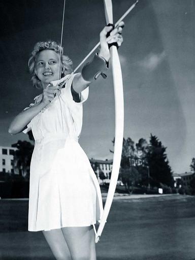 | Keywords: people monochrome WiN-40-32: How U.S. Navy Nurses Keep Fit. “Keep fit to keep fighting men fit,” is the motto of nurses at the U.S. Naval Hospital, San Diego, California, who have inaugurated a rigorous physical training program. Voluntarily participating in sports and calisthenics, the U.S. Navy Nurses are preparing themselves to withstand the wartime physical demands of long hours during emergencies and of service outside the continental limits of the United States. The sports have the additional advantage of providing off-hour recreation and of keeping the nurses trim. Added zest has been given the games by competition between nurses quartered at Balboa Park and those living on the hospital compound, and between nurses and WAVES. Unused grounds on the hospital reservation on have been utilized in providing recreational facilities. A hilly area in front of the administration building has been covered with grass, trees and flowers and converted into a nine-hole golf course. Shown is U.S. Navy Nurse Helen Trebolo, USNR, keeping herself fit by practicing archery several times each week. Her regular job is that of a dietician in the sick officer quarters, June 1943. Courtesy of BUMED Historian’s Office. (2/20/2009). WiN-40-32: How U.S. Navy Nurses Keep Fit. “Keep fit to keep fighting men fit,” is the motto of nurses at the U.S. Naval Hospital, San Diego, California, who have inaugurated a rigorous physical training program. Voluntarily participating in sports and calisthenics, the U.S. Navy Nurses are preparing themselves to withstand the wartime physical demands of long hours during emergencies and of service outside the continental limits of the United States. The sports have the additional advantage of providing off-hour recreation and of keeping the nurses trim. Added zest has been given the games by competition between nurses quartered at Balboa Park and those living on the hospital compound, and between nurses and WAVES. Unused grounds on the hospital reservation on have been utilized in providing recreational facilities. A hilly area in front of the administration building has been covered with grass, trees and flowers and converted into a nine-hole golf course. Shown is U.S. Navy Nurse Helen Trebolo, USNR, keeping herself fit by practicing archery several times each week. Her regular job is that of a dietician in the sick officer quarters, June 1943. Courtesy of BUMED Historian’s Office. (2/20/2009). |