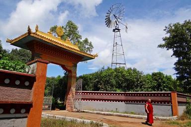 Keywords: wind mill wind power tibetan settlement gate ornate monk mundgod india