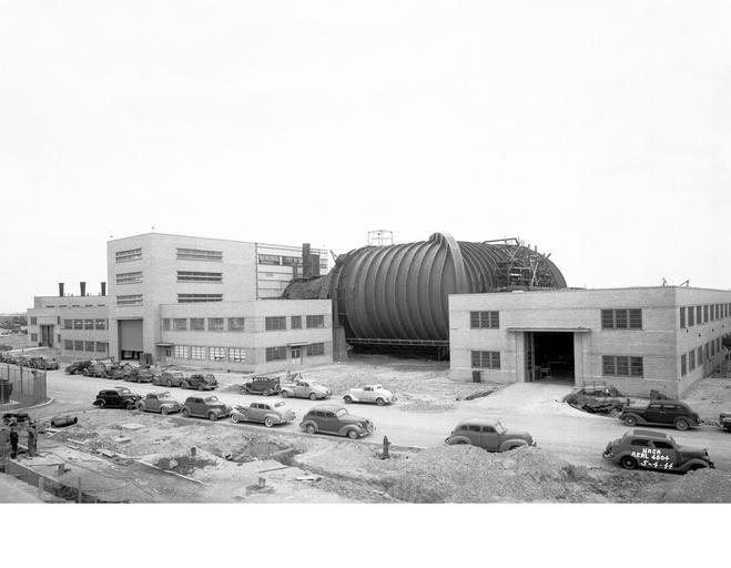 Keywords: blackandwhite monochrome outdoor black and white Full Description: The Altitude Wind Tunnel at the Aircraft Engine Research Laboratory (now NASA Glenn Research Center) in Cleveland, OH, under construction in 1944. View taken facing southeast, showing scaffolding for refrigerant line construction to west end of tunnel, and application of insulation material on throat section. UID: SPD-GRIN-GPN-2000-00 0343 Date: May 5, 1944 Full Description: The Altitude Wind Tunnel at the Aircraft Engine Research Laboratory (now NASA Glenn Research Center) in Cleveland, OH, under construction in 1944. View taken facing southeast, showing scaffolding for refrigerant line construction to west end of tunnel, and application of insulation material on throat section. UID: SPD-GRIN-GPN-2000-00 0343 Date: May 5, 1944 |