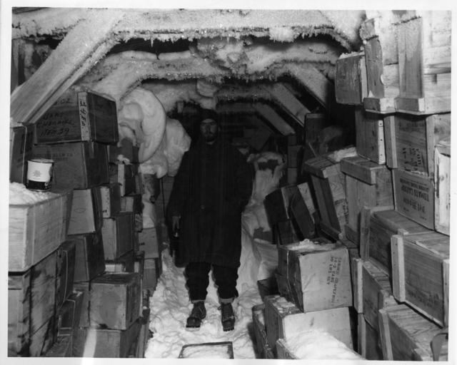 <b>Summary</b>: Image of a member of Operation Windmill standing inside a building in Antarctica. The man is surrounded by supplies. Operation Windmill (1947-1948) was an expedition established by the Chief of Naval Operations to train personnel, test equipment, and reaffirm American interests in Antarctica
