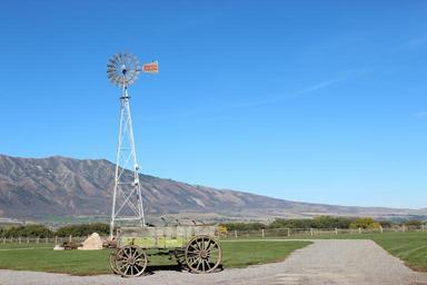 Keywords: windmill farm countryside old wagon country field farmland rustic scene land
