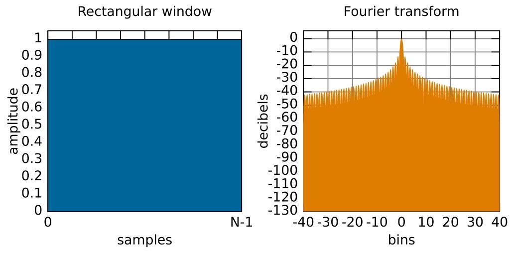 | Keywords: Window function and frequency response - Rectangular.svg en Window function and its Fourier transform Rectangular window 2013-02-13 04 44 18 own Bob K original version Olli Niemitalo BobQQ The SVG images generated by the enclosed Octave source code replace the older PNG images cc-zero Octave script The script below generates these SVG images File Window function and frequency response - Bartlett-Hann svg File Window function and frequency response - Blackman svg File Window function and frequency response - Blackman-Harris svg File Window function and frequency response - Blackman-Nuttall svg File Window function and frequency response - Approximate confined Gaussian sigma t 0 1N svg File Window function and frequency response - Confined Gaussian sigma t 0 1N svg File Window function and frequency response - Cosine svg File Window function and frequency response - Dolph-Chebyshev alpha 5 svg File Window function and frequency response - DPSS alpha 2 svg File Window function and frequency response - DPSS alpha 3 svg File Window function and frequency response - Exponential 60dB decay svg File Window function and frequency response - Exponential half window decay svg File Window function and frequency response - Gaussian sigma 0 4 svg File Window function and frequency response - Hamming alpha 0 53836 svg File Window function and frequency response - Hann svg File Window function and frequency response - Hann-Poisson alpha 2 svg File Window function and frequency response - Kaiser alpha 2 svg File Window function and frequency response - Kaiser alpha 3 svg File Window function and frequency response - Lanczos svg File Window function and frequency response - Nuttall continuous first derivative svg File Window function and frequency response - Parzen svg File Window function and frequency response - Planck-Bessel epsilon 0 1 alpha 4 45 svg File Window function and frequency response - Planck-taper epsilon 0 1 svg File Window function and frequency response - Rectangular svg File Window function and frequency response - SRS flat top svg File Window function and frequency response - Triangular svg File Window function and frequency response - Tukey alpha 0 5 svg File Window function and frequency response - Welch svg The script is not MATLAB-compatible <source lang matlab > pkg load signal graphics_toolkit gnuplot set 0 defaultaxesfontname sans-serif set 0 defaultaxesfontsize 12 set 0 defaultaxeslinewidth 1 function plotWindow w wname wfilename wspecifier wfilespecifier M 32; Fourier transform size as multiple of window length Q 512; Number of samples in time domain plot P 40; Maximum bin index drawn dr 130; Maximum attenuation dB drawn in frequency domain plot N length w ; B N sum w 2 /sum w 2 noise bandwidth bins k 0 1/Q 1; w2 interp1 0 1/ N-1 1 w k ; if M/N < Q Q M/N; endif figure 'position' 1 1 1200 600 subplot 1 2 1 area k w2 'FaceColor' 0 0 4 0 6 'edgecolor' 0 0 0 'linewidth' 1 if min w > -0 01 ylim 0 1 05 set gca 'YTick' 0 0 1 1 else ylim -1 5 set gca 'YTick' -1 1 5 endif ylabel 'amplitude' set gca 'XTick' 0 1/8 1 set gca 'XTickLabel' ' 0'; ' '; ' '; ' '; ' '; ' '; ' '; ' '; 'N-1' grid 'on' set gca 'gridlinestyle' '-' xlabel 'samples' if strcmp wspecifier title cstrcat wname ' window' 'interpreter' 'none' else title cstrcat wname ' window ' wspecifier ' ' 'interpreter' 'none' endif set gca 'Position' 0 094 0 17 0 38 0 71 H abs fft w zeros 1 M-1 N ; H fftshift H ; H H/max H ; H 20 log10 H ; H max -dr H ; k 1 M N-1-M N/2 /M; k2 -P 1/M P; H2 interp1 k H k2 ; subplot 1 2 2 set gca 'FontSize' 28 h stem k2 H2 '-' ; set h 'BaseValue' -dr xlim -P P ylim -dr 6 set gca 'YTick' 0 -10 -dr set findobj 'Type' 'line' 'Marker' 'none' 'Color' 0 8710 0 49 0 grid 'on' set findobj 'Type' 'gridline' 'Color' 871 49 0 set gca 'gridlinestyle' '-' ylabel 'decibels' xlabel 'bins' title 'Fourier transform' set gca 'Position' 0 595 0 17 0 385 0 71 if strcmp wfilename wfilename wname; endif if strcmp wfilespecifier wfilespecifier wspecifier; endif if strcmp wfilespecifier savetoname cstrcat 'Window function and frequency response - ' wfilename ' svg' ; else savetoname cstrcat 'Window function and frequency response - ' wfilename ' ' wfilespecifier ' svg' ; endif print savetoname '-dsvg' '-S1200 600' close endfunction N 2 17; Window length B is equal for Triangular and Bartlett from 2 17 k 0 N-1; s 0 1 N; w exp - k - N - 1 /2 2 / 4 s 2 - exp - -1/2 - N - 1 /2 2 / 4 s 2 exp - k+N - N - 1 /2 2 / 4 s 2 + exp - k-N - N - 1 /2 2 / 4 s 2 / exp - -1/2+N - N - 1 /2 2 / 4 s 2 + exp - -1/2 - N - N - 1 /2 2 / 4 s 2 ; plotWindow w App conf Gaussian Approximate confined Gaussian ' 0 1N' sigma_t 0 1N ; w parzenwin N '; plotWindow w Parzen ; w 1- k- N-1 /2 / N+1 /2 2; plotWindow w Welch ; alpha 5; Attenuation in 20 dB units w chebwin N alpha 20 '; plotWindow w Dolph Chebyshev Dolph-Chebyshev ' 5' alpha 5 w 0 35875 - 0 48829 cos 2 pi k/ N-1 + 0 14128 cos 4 pi k/ N-1 -0 01168 cos 6 pi k/ N-1 ; plotWindow w Blackman Harris Blackman-Harris w 0 62 -0 48 abs k/ N-1 -0 5 +0 38 cos 2 pi k/ N-1 -0 5 ; plotWindow w Bartlett Hann Bartlett-Hann w 0 53836 - 0 46164 cos 2 pi k/ N-1 ; plotWindow w Hamming Hamming ' 0 53836' alpha 0 53836 w 1 - 1 93 cos 2 pi k/ N-1 + 1 29 cos 4 pi k/ N-1 -0 388 cos 6 pi k/ N-1 +0 028 cos 8 pi k/ N-1 ; plotWindow w SRS flat top alpha 2; w 1/2 1 - cos 2 pi k/ N-1 exp alpha abs N-2 k-1 / 1-N ; plotWindow w Hann Poisson Hann-Poisson ' 2' alpha 2 w 0 42 - 0 5 cos 2 pi k/ N-1 + 0 08 cos 4 pi k/ N-1 ; plotWindow w Blackman w 0 355768 - 0 487396 cos 2 pi k/ N-1 + 0 144232 cos 4 pi k/ N-1 -0 012604 cos 6 pi k/ N-1 ; plotWindow w Nuttall Nuttall continuous first derivative w ones 1 N ; plotWindow w Rectangular w N/2 - abs k- N-1 /2 / N/2 ; plotWindow w Triangular w 0 5 - 0 5 cos 2 pi k/ N-1 ; plotWindow w Hann alpha 0 5; w ones 1 N ; n - N-1 /2 -alpha N/2; L length n ; w 1 L 0 5 1+cos pi abs n -alpha N/2 / 1-alpha N/2 ; w N -1 N-L+1 w 1 L ; plotWindow w Tukey Tukey ' 0 5' alpha 0 5 w sin pi k/ N-1 ; plotWindow