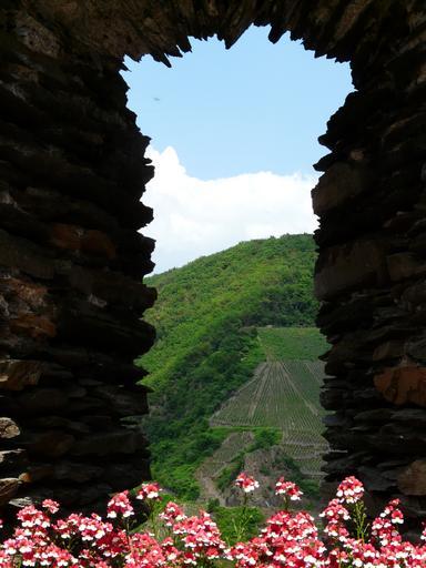 Keywords: window stone stone window by looking sky clouds burg metternich castle ruin metternich vineyards beilstein sachsen germany