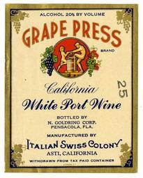 Keywords: text writing photo border sign Repository: California Historical Society Collection: California wine label and ephemera collection Date: undated Call Number: Kemble Spec Col 07 Digital Object ID: Kemble Spec Col 07_014.jpg Preferred Citation: Wine label, Italian Swiss Colony, Grape Press Brand California White Port Wine, California wine label and ephemera collection, Kemble Spec Col 07, courtesy, California Historical Society, Kemble Spec Col 07_014.jpg. Repository: California Historical Society Collection: California wine label and ephemera collection Date: undated Call Number: Kemble Spec Col 07 Digital Object ID: Kemble Spec Col 07_014.jpg Preferred Citation: Wine label, Italian Swiss Colony, Grape Press Brand California White Port Wine, California wine label and ephemera collection, Kemble Spec Col 07, courtesy, California Historical Society, Kemble Spec Col 07_014.jpg. |