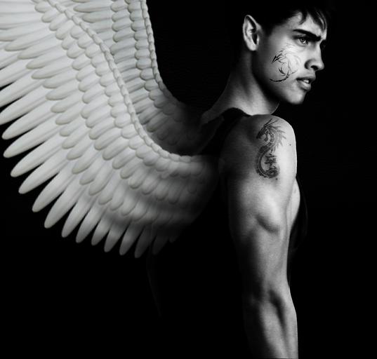 Keywords: wings warrior boy tattoo black and white human model science fiction