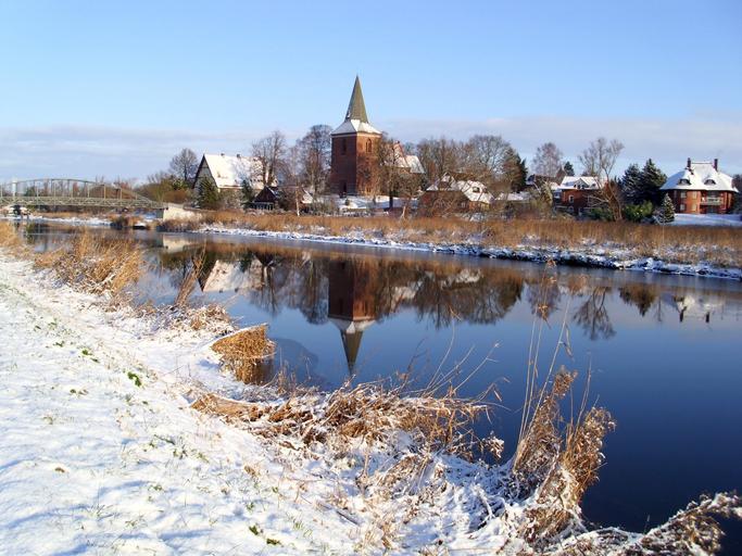 Keywords: winter berkenthin church elbe lübeck canal mirroring reflections water