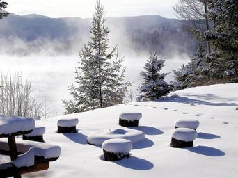 Keywords: winter lake snow fog water landscape scenery trees mountains