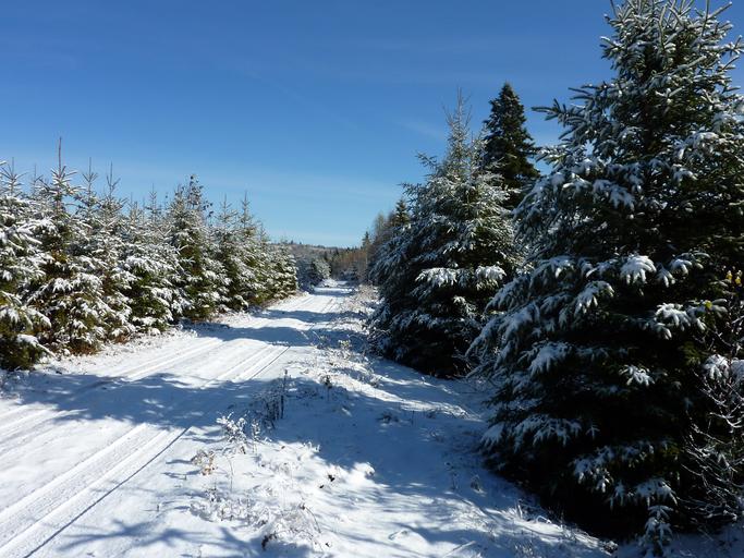 Keywords: winter landscape pine trees snow road forest cold season snowfall tree sky rural seasonal