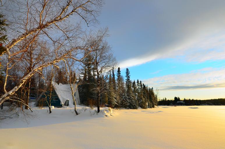 Keywords: winter landscape trees birch snow ice frozen lake nature house clouds