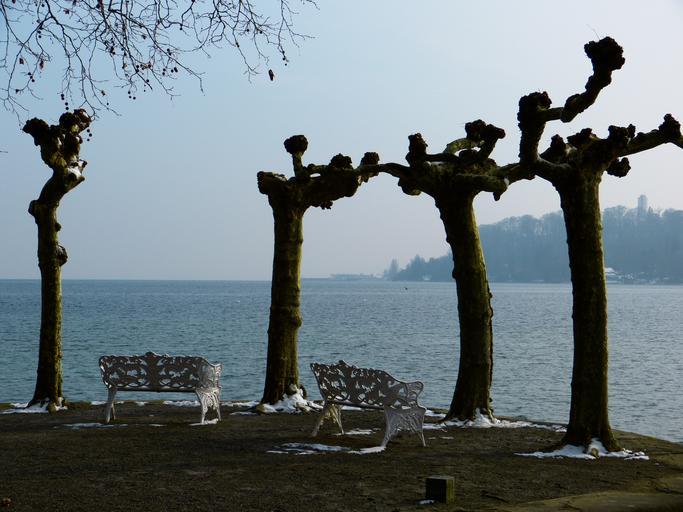 Keywords: winter mood plane trees bank view water lake constance lake mainau island trees