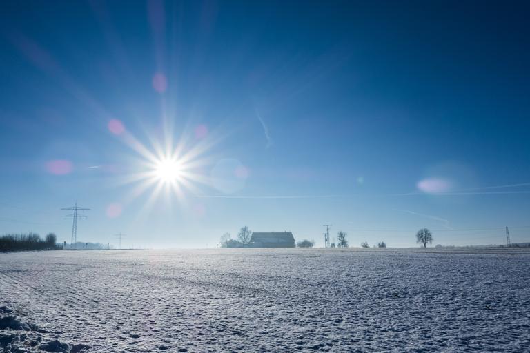 Keywords: winter snow wintry sun blue sky partly cloudy sunbeam light back light cold landscape snowy snow magic