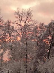 Keywords: winter wintry snow cold icy forest trees snowy sky sunset pink afterglow glow