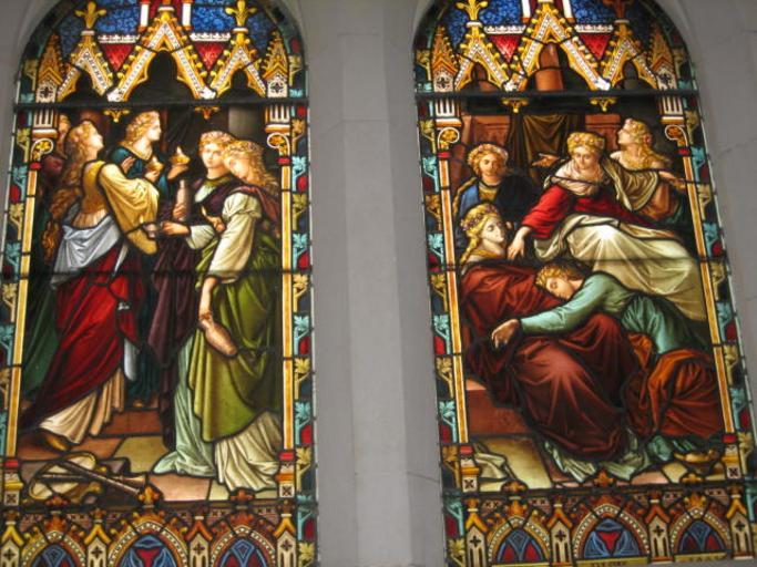 Keywords: Wise and foolish.jpg Depiction of the Parable of the Ten Virgins Photograph of stained glass window at Scots' Church Melbourne Own 2007-10-28 StAnselm Stained glass windows of Ten virgins Stained glass windows in Australia Scots' Church