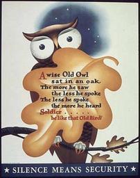 | Keywords: WiseOldOwlWartime.jpg en A poster using the proverb of A Wise Old Owl produced 1941-5 2012-06-20 http //history1900s about com/library/photos/blywwiip210 htm US Government PD-USGov Uploaded with UploadWizard Owls in art World War II posters about secrecy from the United States Secrecy in propaganda |