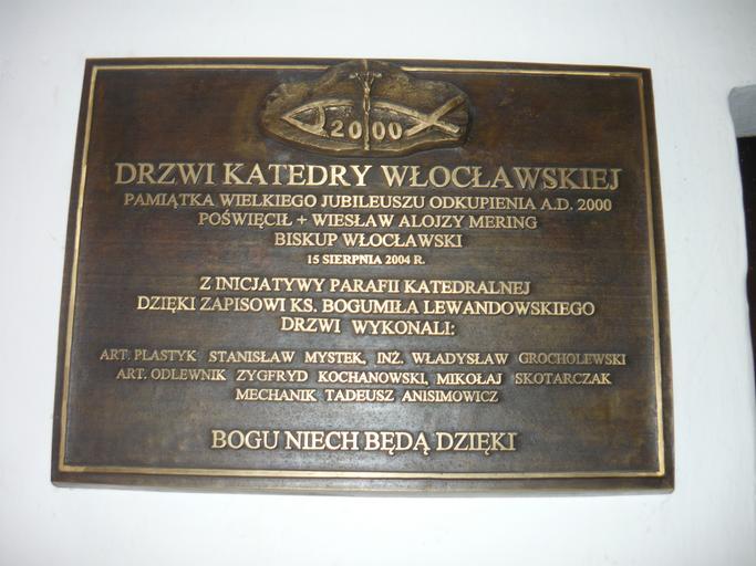 Keywords: Włocławek-Plaque in Cathedral.JPG en Plaque in memory of new door of Cathedral set in Włocławek's Cathedral pl Tablica pamiątkowa na cześć wstawienia nowych Drzwi do Włocławskiej Katedry w jej przedsionku ru емо иальная доска v pamyat' введение новой две и в Влoцлaвcкйх собо e в ее вестибюлe de Denkmal zu Ehren des Einsatzes Tür in der Vorhalle von Kathedrale in Wloclawek own Mariochom 13 lipca 2010 Plaques in Włocławek Interior of the Włocławek Cathedral