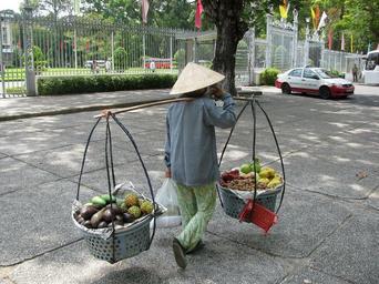 Keywords: indonesia woman working carrying fruit baskets balanced city urban buildings car street outside