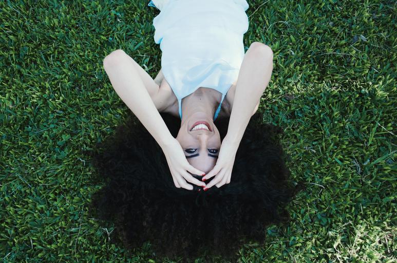 Keywords: woman hairstyle lying meadow grass park outdoors summer smile happy hair female young style model face person portrait black attractive hair model
