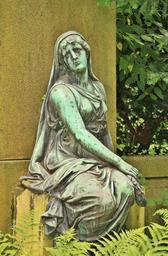 Keywords: woman human sculpture statue bronze bronze statue cemetery grave tomb mourning tears emotions sit fate death mood weathered old antique haunting fern stainless discolored aachen ostfriedhof