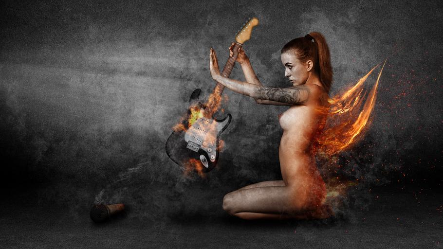 Keywords: woman naked act sexy erotic body fig music rock angel fire smoke hot young light guitar face shadow fog light and shadow person