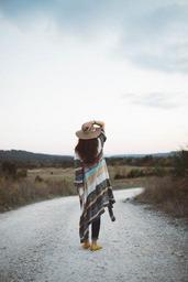 Keywords: woman outdoors back hat fashion summer ethnic style female young lifestyle freedom gravel road landscape view looking