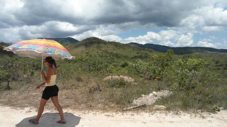 Keywords: woman parasol heiss heat shade tree hill sky blue