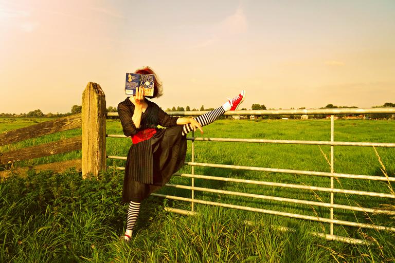 Keywords: woman person people model fashion fashion model clothes stripes pantyhose black dress belt red belt pose gate split exercise flexible supple book reading