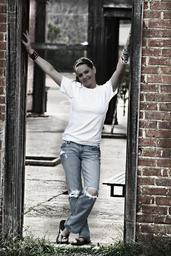 Keywords: woman posing relaxed park jeans casual standing smiling doorway door