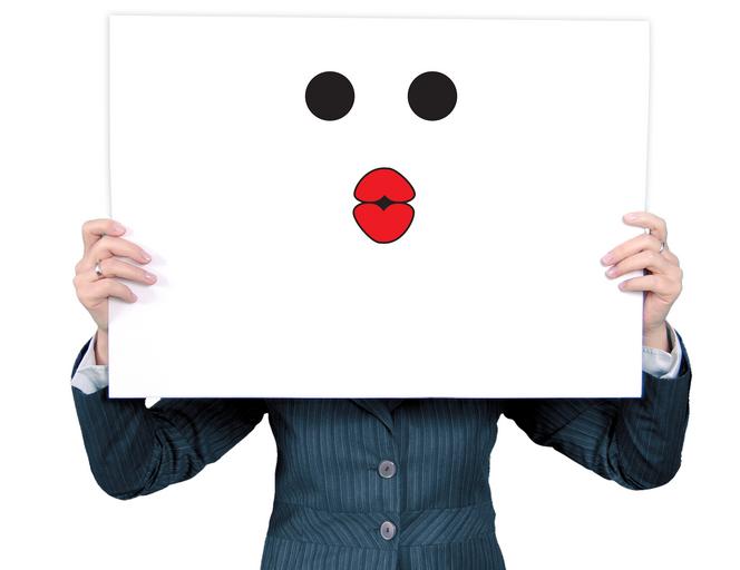 Keywords: woman smiley emoticon surprise amazed face hint appearance look impression mask contributed inspect mirage deception bill expression businesswoman information board message business card contact business cards company business