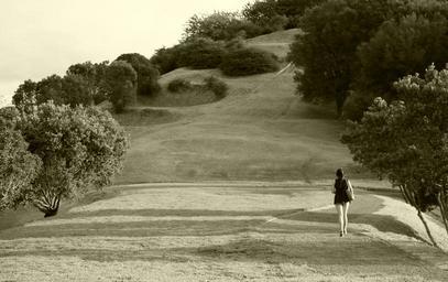 Keywords: woman walk girl nature afternoon one tree hill loneliness sexy pretty brunette miniskirt legs long legs