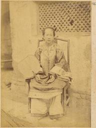 | Keywords: Woman with Traditional Lotus (Bound) Feet Seated with Fan. China, 1874-75 WDL1938.png Artwork ru Боя ский Адольф- иколай Э азмович fr Boiarskii Adolf-Nikolay Erazmovich en Boiarskii Adolf-Nikolay Erazmovich zh 阿道夫 伊拉莫维奇 鲍 尔斯基 pt Boiarskii Adolf-Nikolay Erazmovich ar أدولف-نيكولاي إرازموفيتش بويارسكي es Boiarskii Adolf-Nikolay Erazmovich ru Женщина с т адиционно забинтованными ножками-лотосами сидит с вее ом Китай 1874 1875 гг fr Femme avec les pieds bandés en forme de lotus selon la tradition avec un éventail Chine 1874-1875 en Woman with Traditional Lotus Bound Feet Seated with Fan China 1874-75 zh 裹了三寸金莲(缠足)的女人,手拿 把扇子 中国,1874-1875 年 pt Mulher com pés de lótus enfaixados tradicionais sentada com leque China 1874-1875 ar سيدة بأقدام اللوتس المربوطة التقليدية تجلس وبيدها مروحة الصين 1874-1875 ru В 1874 1875 гг оссийское п авительство нап авило в Китай учено-то говую экспедицию с целью поиска новых сухопутных ма ш утов к китайскому ынку оценок возможностей для более активной то говли и для асположений консульств и фаб ик а также сбо а инфо мации о Дунганском восстании бушевавшем в то в емя в западных айонах Китая Экспедиция уководителем кото ой был полковник Гене ального штаба Ю А Сосновский состояла из девяти человек капитана атусовского топог афа докто а Павла Яковлевича Пясецкого научного сот удника пе еводчиков с усского и китайского языков т оих казаков и фотог афа экспедиции Адольфа Э азмовича Боя ского Экспедиция отп авилась из Санкт-Пете бу га в Шанхай че ез Улан-Бато онголия Пекин и Тяньцзинь и затем последовала по ма ш уту вдоль еки Янцзы по Великому шелковому пути п оходя че ез оазис Хами к озе у Зайсан об атно в Россию Боя ский сделал около 200 снимков кото ые легли в основу уникальных мате иалов для изучения Китая того в емени Большая часть фотог афий вошла в этот альбом кото ый позже стал частью коллекции Те езы К истины а ии соб анной импе ато ом Б азилии Пед у II и пе еданной им ациональной библиотеке Б азилии <br>Китайцы; Вее ы; Бинтование ног; Память ми а; По т етные фотог афии; Женщины fr En 1874-1875 le gouvernement russe organisa une mission commerciale et de recherche en Chine Cette mission avait pour objectif de trouver de nouvelles routes terrestres vers le marché chinois d'étudier les perspectives d'une expansion commerciale de rechercher des sites pour l'installation de consulats et d'usines et de recueillir des informations sur la révolte de Dungan qui faisait alors rage dans les provinces de la Chine occidentale Composée de 9 hommes et dirigée par le lieutenant-colonel Iulian A Sosnovskii de l'état-major général de l'armée cette mission comprenait également un topographe le capitaine Matusovskii un responsable scientifique le Dr Pavel Iakovlevich Piasetskii des interprètes chinois et russes trois sous-officiers cosaques et le photographe de la mission Adolf Erazmovich Boiarskii La mission se déroula de Saint-Pétersbourg à Shanghai en passant par Oulan-Bator Mongolie Pékin et Tianjin Elle longea ensuite le fleuve Yangtsé et suivit la grande Route de la soie à travers l'oasis Hami et jusqu'au lac Zaysan de retour en Russie Adolf Erazmovich Boiarskii prit quelque 200 photographies ce qui constitue une source unique pour l'étude de la Chine de cette période La plupart des photographies prises durant cette mission apparaissent dans cet album lequel rejoignit par la suite la collection Thereza Christina Maria rassemblée par l'empereur Pierre II du Brésil qui en fit don à la Bibliothèque nationale du Brésil <br>Chinois; Éventails; Pieds bandés; Mémoire du monde; Portraits photographiques; Femmes en In 1874-75 the Russian government sent a research and trading mission to China to seek out new overland routes to the Chinese market report on prospects for increased commerce and locations for consulates and factories and gather information about the Dungan Revolt then raging in parts of western China Led by Lieutenant Colonel Iulian A Sosnovskii of the army General Staff the nine-man mission included a topographer Captain Matusovskii; a scientific officer Dr Pavel Iakovlevich Piasetskii; Chinese and Russian interpreters; three non-commissioned Cossack soldiers; and the mission photographer Adolf Erazmovich Boiarskii The mission proceeded from Saint Petersburg to Shanghai via Ulan Bator Mongolia Beijing and Tianjin and then followed a route along the Yangtze River along the Great Silk Road through the Hami oasis to Lake Zaysan back to Russia Boiarskii took some 200 photographs which constitute a unique resource for the study of China in this period Most of the photographs are included in this album which later became part of the Thereza Christina Maria Collection assembled by Emperor Pedro II of Brazil and given by him to the Natio