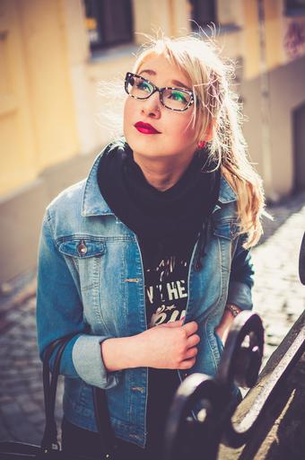 Keywords: woman young girl person blonde glasses female hair fashion face casual jeans jacket lifestyle looking lipstick red