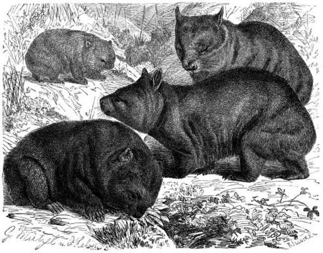 | Keywords: Wombat.png taken from Brehms Thierleben Allgemeine Kunde des Thierreichs Dritter Band Erste Abtheilung Säugethiere Zweiter Band Raubthiere Kerfjäger Nager Zahnarme Beutel- und Gabelthiere Zweite umgearbeitete und vermehrte Auflage Kolorirte Ausgabe Leipzig Verlag des Bibliographischen Instituts 1883 CD-ROM by directmedia Berlin Permission to use is given PD-old Brehms Tierleben Marsupialia Vombatidae | ||||