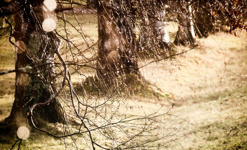 Keywords: wood trees line symmetry yellow brown warm dof rain water drop