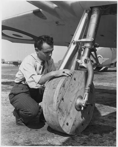 View Original:Wooden_wheels_are_attached_to_a_P-51_("Mustang")_fighter_plane_so_it_may_be_moved_around_the_ramp_at_the_Inglewood..._-_NARA_-_195491.tif (2409x3000)