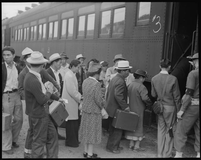 | Keywords: Woodland, California. Evacuees of Japanese ancestry are boarding a special train for Merced Assembl . . . - NARA - 537818.jpg Scope and content The full caption for this photograph reads Woodland California Evacuees of Japanese ancestry are boarding a special train for Merced Assembly center These people are a part of a group of 750 persons evacuated from this rich farming area General notes 537818 Local identifier 210-G-C504 Department of the Interior War Relocation Authority 02/16/1944 - 06/30/1946 NARA-Author Lange Dorothea 1895-1965 Photographer 1372774 <br /> Still Picture Records Section Special Media Archives Services Division NWCS-S National Archives at College Park 8601 Adelphi Road College Park MD 20740-6001 1942-05-20 Record group Record Group 210 Records of the War Relocation Authority 1941 - 1989 Record group ARC 537 Central Photographic File of the War Relocation Authority compiled 1942 - 1945 Series ARC 536000 File unit File unit ARC Variant control numbers NAIL Control Number NWDNS-210-G-C504 Other versions <gallery> File Woodland _California _Evacuees_of_Japanese_ancestry_are_boarding_a_special_train_for_Merced_Assembl_ _ _ _-_NARA_-_537818 tif tif File Woodland _California _Evacuees_of_Japanese_ancestry_are_boarding_a_special_train_for_Merced_Assembl_ _ _ _-_NARA_-_537818 jpg jpg </gallery> NARA-cooperation PD-USGov Japanese American internment processing in Woodland California Dorothea Lange |