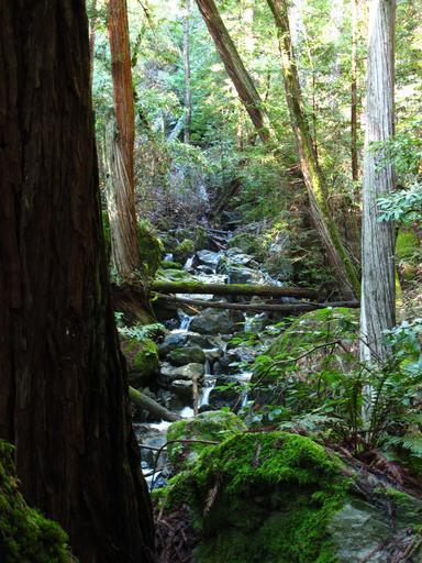 Keywords: woods california stream creek green forest moss rocks cascade nature tree outdoors redwood wilderness plant trunk